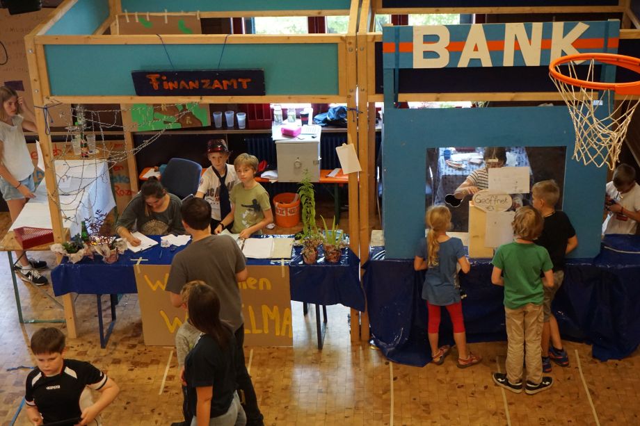 Die Kinder wählen am 3. Tag eine/n Bürgermeister*in, der/ die dann die unterschiedlichen Interessen der Bürger*innen vertritt. So entsteht über die Woche eine Stadt mit Infrastruktur.